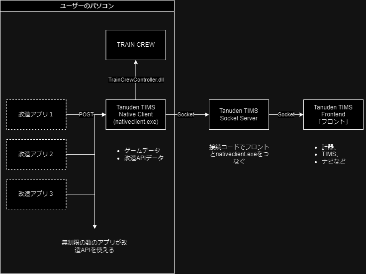 タヌ電TIMS API（改造API）はRESTを中心に構成されており、フロントエンドに到達する前にTrainCrewから取得したデータを変更するために使用することができます。